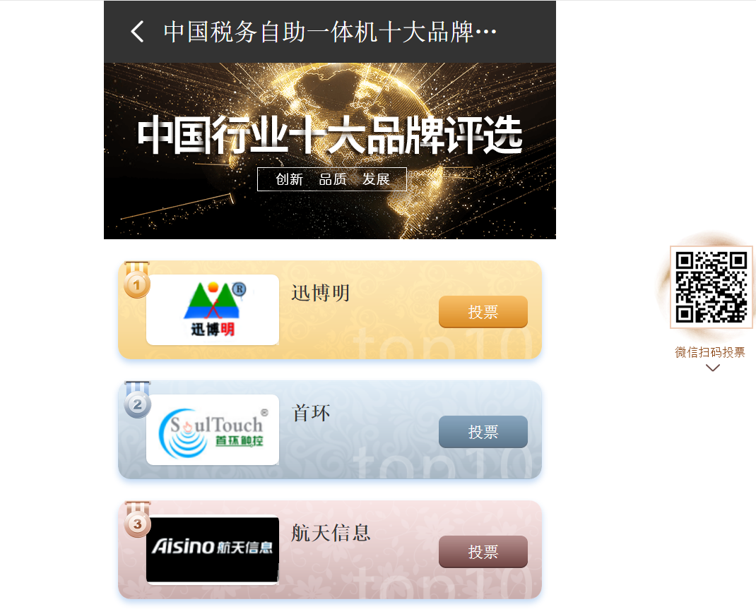 加強品牌建設,有利于推動經濟大國向經濟強國轉變,有利于滿足人們更高層次物質文化需求,有利于弘揚中華文化、提升中國形象。安徽迅博智能科技有限公司以"助力中國稅務自助一體機品牌發展,傳播企業品牌價值"為宗旨,為消費者選購和經銷商經營提供品牌選擇依據,憑借可信品牌數據庫的優勢,以大眾網友評價點評、品牌滿意度調查、用戶體驗度為基礎,結合有關企業信息、媒體報道、研究機構進行綜合評價,實時推出各行業中品牌美譽度高、產品質量優、企業信用好的行業十強品牌。